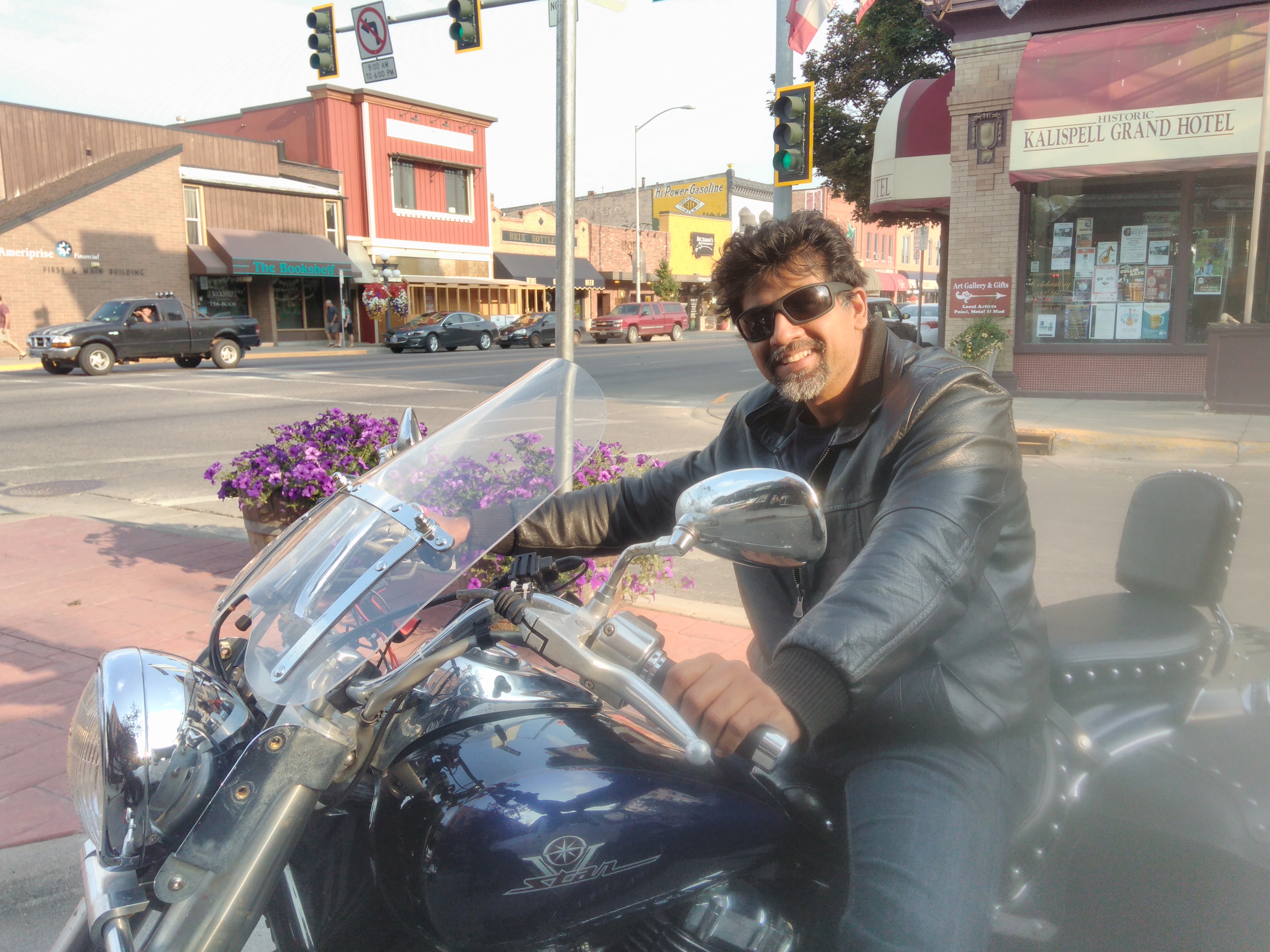 The next morning we had our staple ‘on-the-road-breakfast’ of oatmeal, coffee for me and tea for A and were on the road by 7:30 am. It was quite pleasant weather-wise in contrast to the ride the day before. We stopped at Owen’s in Newport for some food, this is an old school grocery store and deli, the food was good and the staff very friendly and welcoming, totally worth the visit. Continuing on Route 2 we crossed the Idaho Panhandle making a brief stop at Bonner’s Ferry and passing through Leonia Ghost town and into Montana. By this time A had decided that a short stop every 50 miles was needed to stretch and perhaps break the monotony of being the pillion rider. This turned out out to be a great idea as it gave us more opportunity to take in the scenery. We also hit some rain on the way, A’s first taste of getting rained on, on a motorcycle, something that takes a little getting used to. We made a stop at the Moose Crossing Campground to refuel bike and body. Aroma of freshly baked pie lured us into the shop there, unfortunately there was no pie and we had to make do with some cookies and coffee, which were delicious and gave us a much needed boost. We pulled into Kalispell which bills itself as the gateway to Glacier National Park. We had booked a room at the Blue and White Motel, after checking in we headed out for some dinner. On recommendation of the manager at the motel we went for some Chinese at Alley Connection Restaurant, both the food and service were great, would definitely revisit next time in Kalispell.