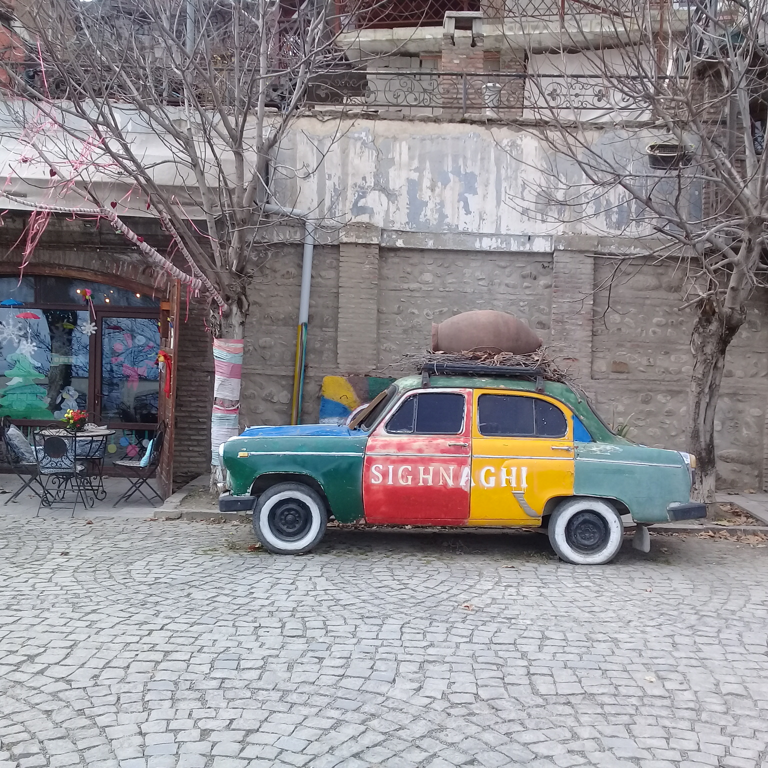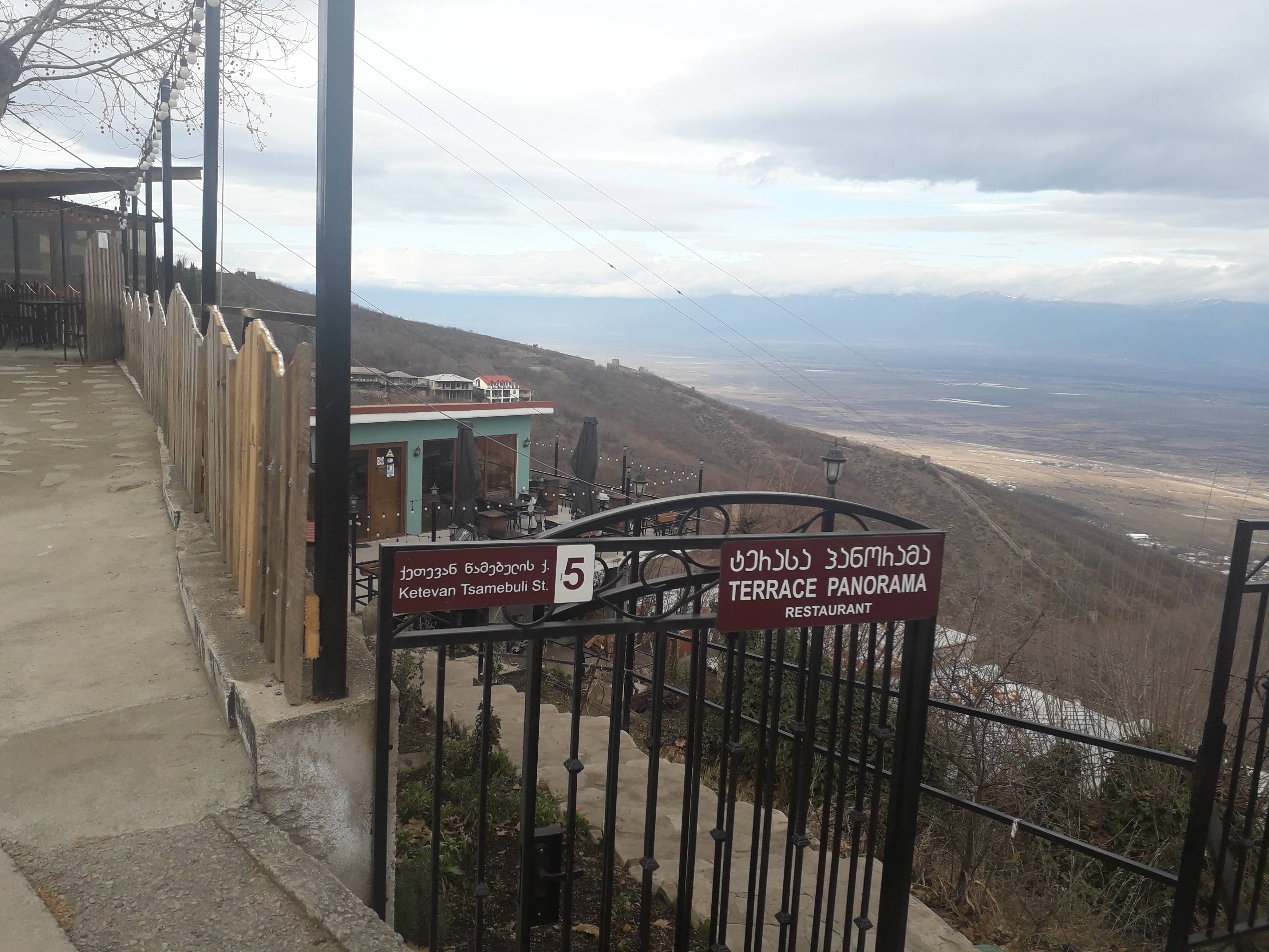 Our final day in Georgia was spent visiting the town of Sighnagi in the Kakheti region. This is part of the Georgian wine trail, and one can see the endless vineyards one the way to the town. The town is situated high in the foothills of the Caucasus Mountains which can be seen looming majestically in the distance. It is known for its quaint houses and cobblestone streets and has become a destination for local as well as foreign tourists. Although it lies in the heart of the wine growing region, we had overlooked the fact that as it was winter the vineyards on the way had a deserted and withered appearance and it was rather cold as well. After wandering around the town we ended up at the Terrace Panorama Restaurant, the views form the restaurant are absolutely stunning and the food was wonderful. After a very leisurely meal we headed back to Tbilisi, a two hour drive away.