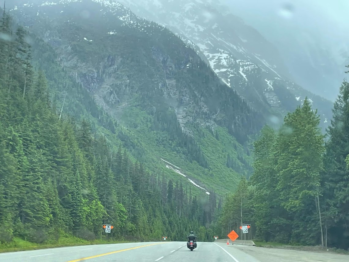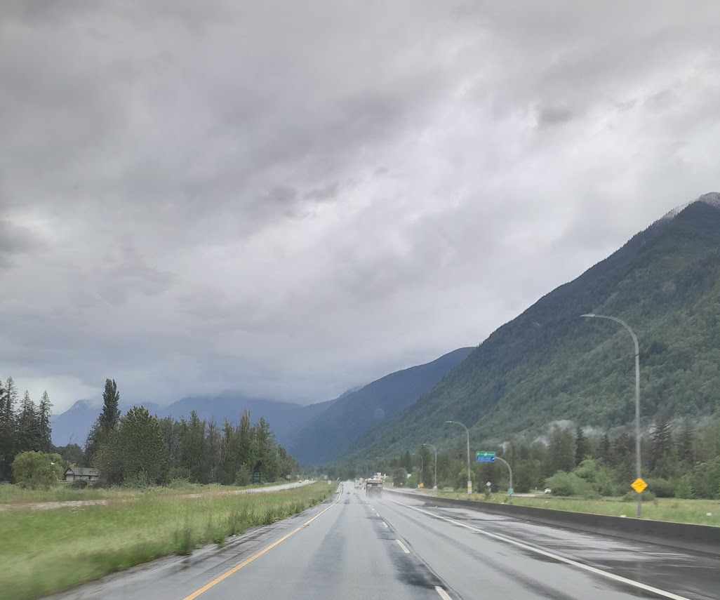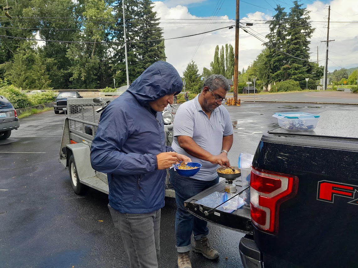 It was supposed to rain throughout the first day of the ‘ride’ so we loaded up the bikes on a trailer and took off from Seattle headed to Kamloops in BC. Stopping just shy of the border for a quick lunch (courtesy Zain’s cooking) we crossed the border at the Sumas crossing. So far the weather has been good and we were a bit disappointed not to have ridden the bikes, but near the Coquihalla highway (‘The Coq’) we hit some serious rain which lasted all the way through to Kamloops. The Airbnb we had booked was excellent and we stayed in relaxing after a long drive.