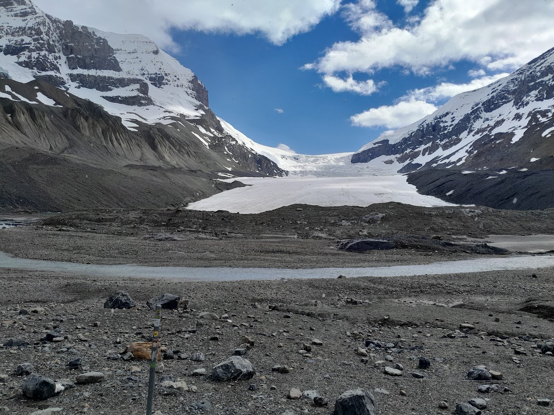 Day 3 of the ride promised was going up to Jasper and then taking the Icefields Parkway (Hwy 93 AB) down to Banff and finishing the day at Golden BC. We rode through the very scenic Mt. Robson park, stopping at several places just to take in the views and made it to Jasper a little before noon. Jasper is a beautiful mountain town and if one has time it is worth spending at least a day here. We had a relaxed lunch at Jasper Pizza, walked a little about town and then headed out towards Banff on the Icefields Highway. On a side note, a couple of months after our trip Jasper was severely affected by wildfires and it seems there has been extensive fire damage. I really hope they are able to get the resources to rebuild the town very soon. Back on the highway, we saw the first ominous sign of bad weather in the distance and we were riding right into it. We hit a few snow flurries on the way to Athabasca glacier, Moose and I went up the short hike from the highway (around 25-30 min up and back), while at the Glacier snow started to come down. We hurried back to the bikes, got into our winter riding gear and were back on the road hoping that we would ride out the weather. Alas, nature had other plans, after very short break in the snow we hit intermittent snow and snow/ice mix and the temperature fell to below freezing. Although the road conditions were getting dangerous, there was not much one could do but keep ones head down and keep riding.