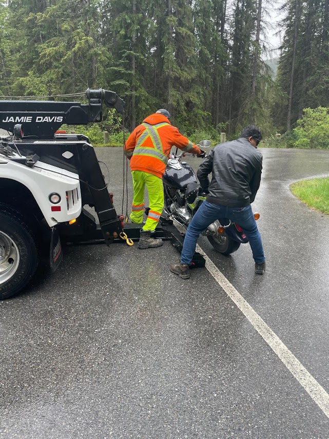 After riding through a snow/ice storm for about 2 long hours, we had taken a break at Faeder Lake about 30 miles from the town of Kelowna in British Columbia. Having warmed up a little, as we were getting back on the road, the gears on Old Bucephalus stopped engaging. So there we were, in the middle of no where, with intermittent icy rain, wondering what to do next.